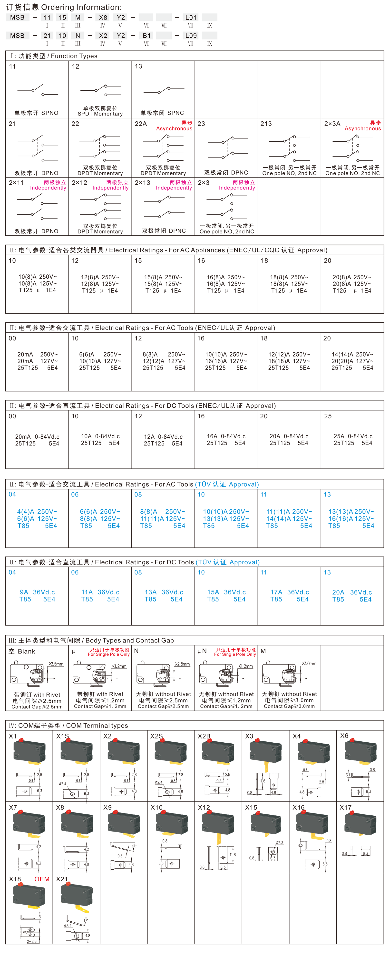 ◆MSB系列是一款标准型的微动开关,有微断开(1mm)、2.5mm和3.0mm触点间隙可以选择,用途极广,可用于各类电动工具和园林工具,如:型材切割机、斜切锯、高压清洗机、打草机、修枝剪、电链锯、电动螺丝刀、电动钉枪、电动喷枪、脚踏开关等,也可应用于各类家用电器及办公设备,如:碎纸机、微波炉、水泵浮球开关、游戏摇杆、门开关等。