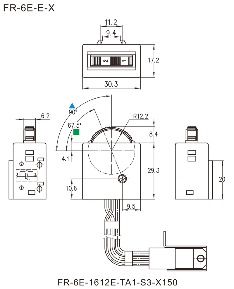 ▲可选转盘一档印字与壳体上表面成67.5°