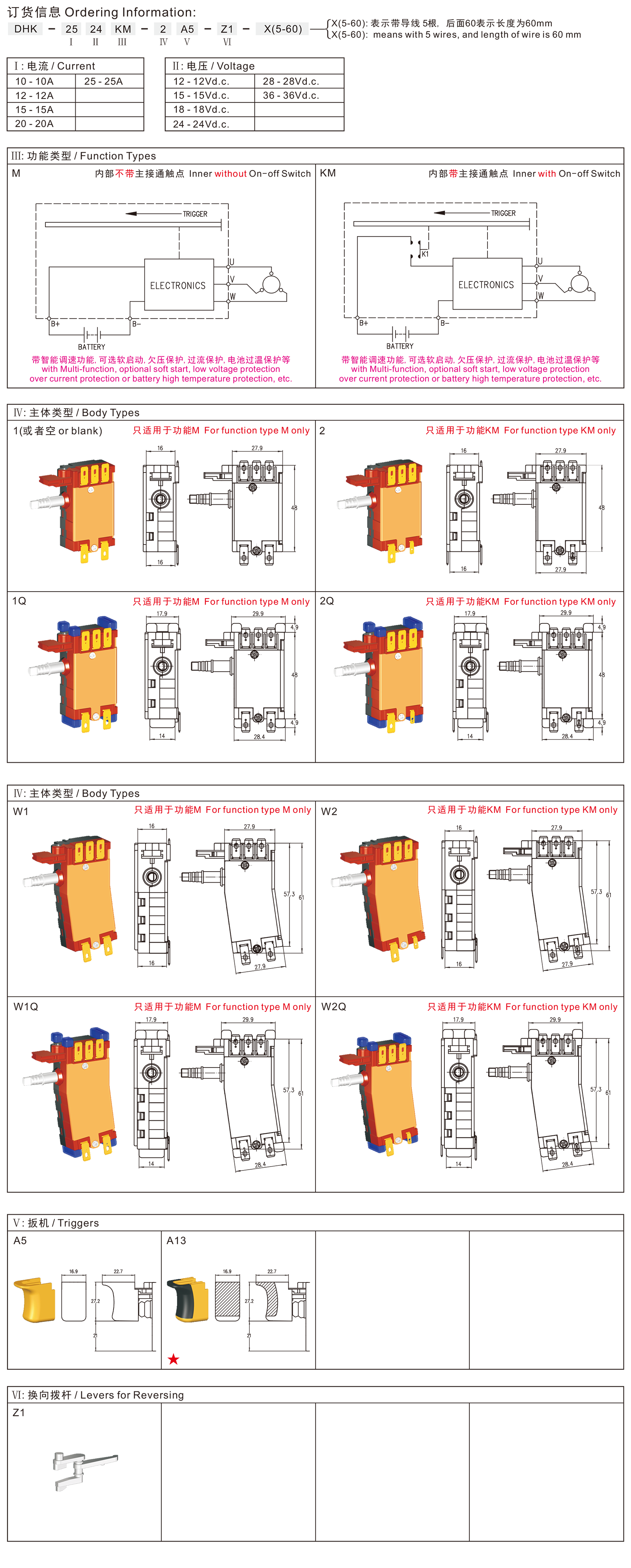 ◆DHK series are one special type DC compositive switches,specially design for Brushless DC motor, integrated dustproof and multi-function, optional with main contact or without, commonly for used in Brushless DC cordless portable power-tools such as: