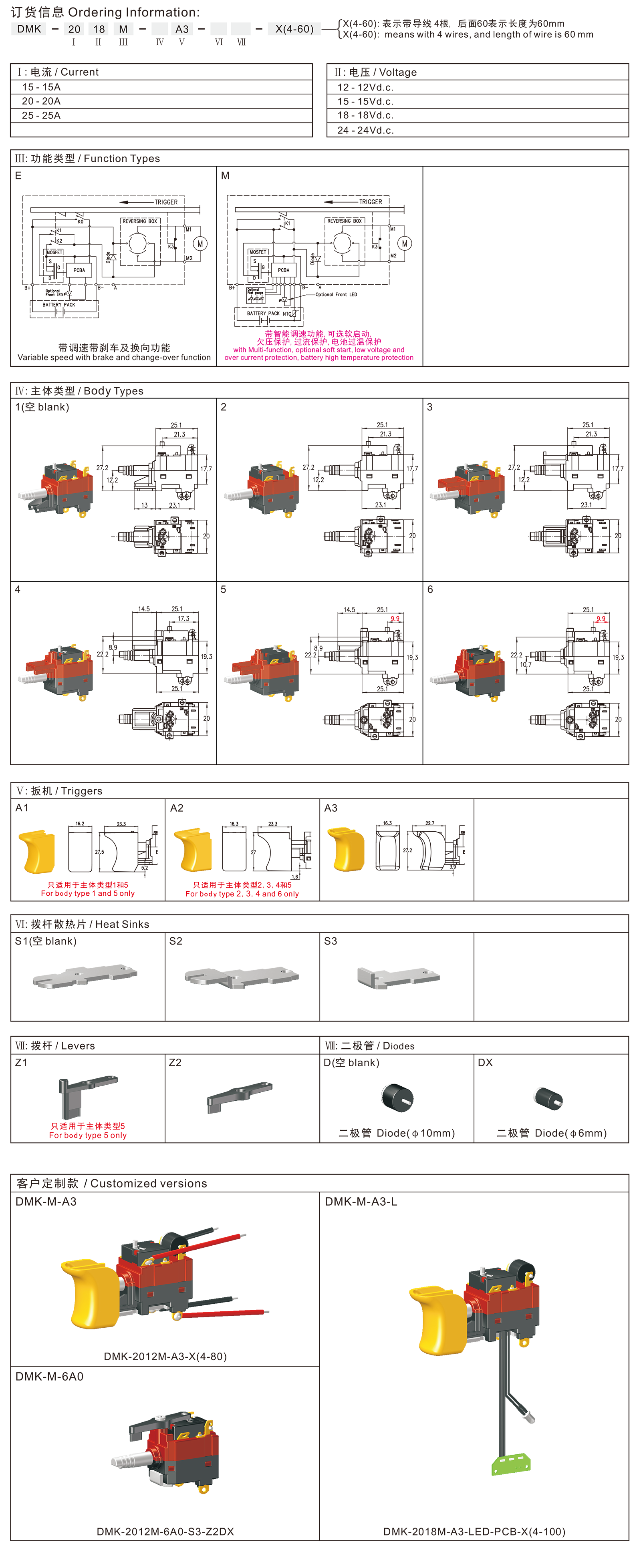 DMK series are one special type DC variable speed trigger switches, integrated dustproof and mechanical brake contact, optional with inner reversing structure, commonly for used in DC cordless portable power-tools such as: Cordless Drills, Cordless Screw Drivers, etc.