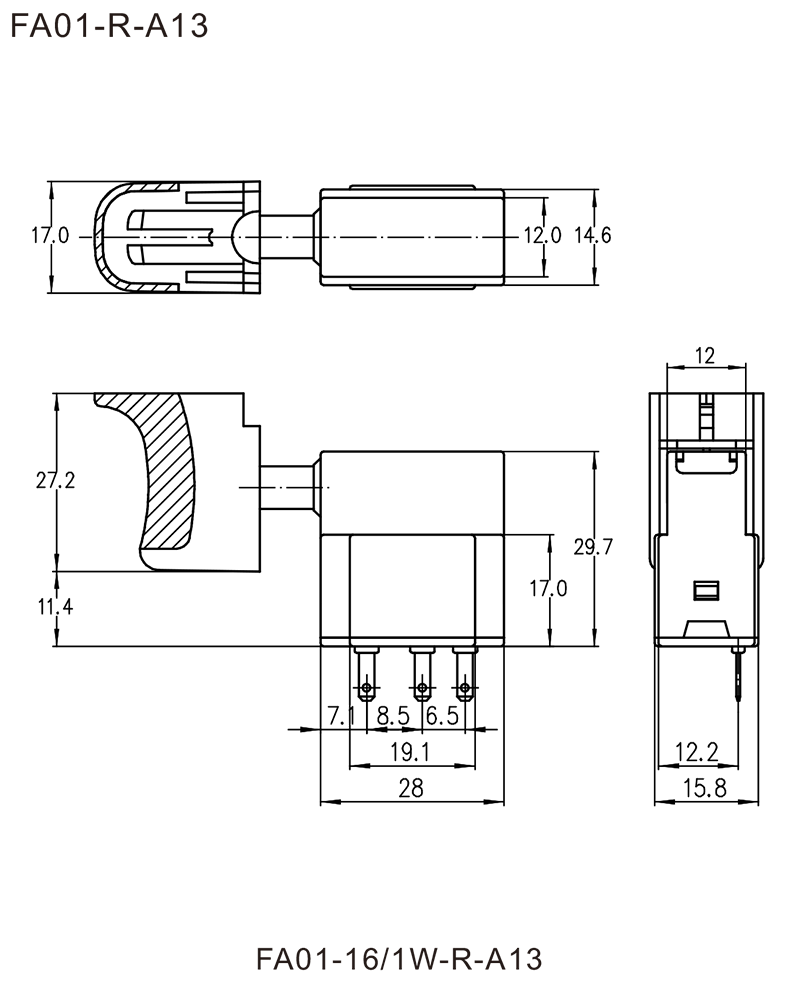◆FA01 series are one general type DC variable speed trigger switches, integrated dustproof and mechanical brake contact, optional with reversing box, for used in DC cordless portable power-tools such as: Cordless Drills, Cordless Screw Drivers, etc. Also special for used in DC medical tools, such as Cordless Bone Drills, Cordless Sternum Saws, Cordless Overhaul Saws, etc.