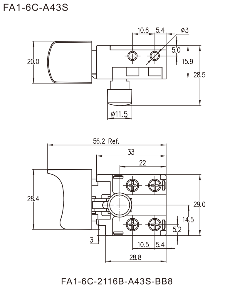 FA1-6C series are general type trigger switch, integrated dustproofwith snap-action structure, commonly for used in portable power tools such as Electric Drills, Rotary Hammers, Reciprocating Saws, Jig Saws, Angle Grinders, Electric Mixers, Cut-Off Machines, Marble Cutters, Electric Routers, Circular Saws, Belt Sanders, Orbit Sanders, Polishers, Electric Planers, Electric Sprayers, Electric Nailers, etc. Besides, they are also suitable for gardening tools, such as Grass Trimmers, Electric Chain Saws, Electric Lawnmowers, Electric Snowthrowers, etc.