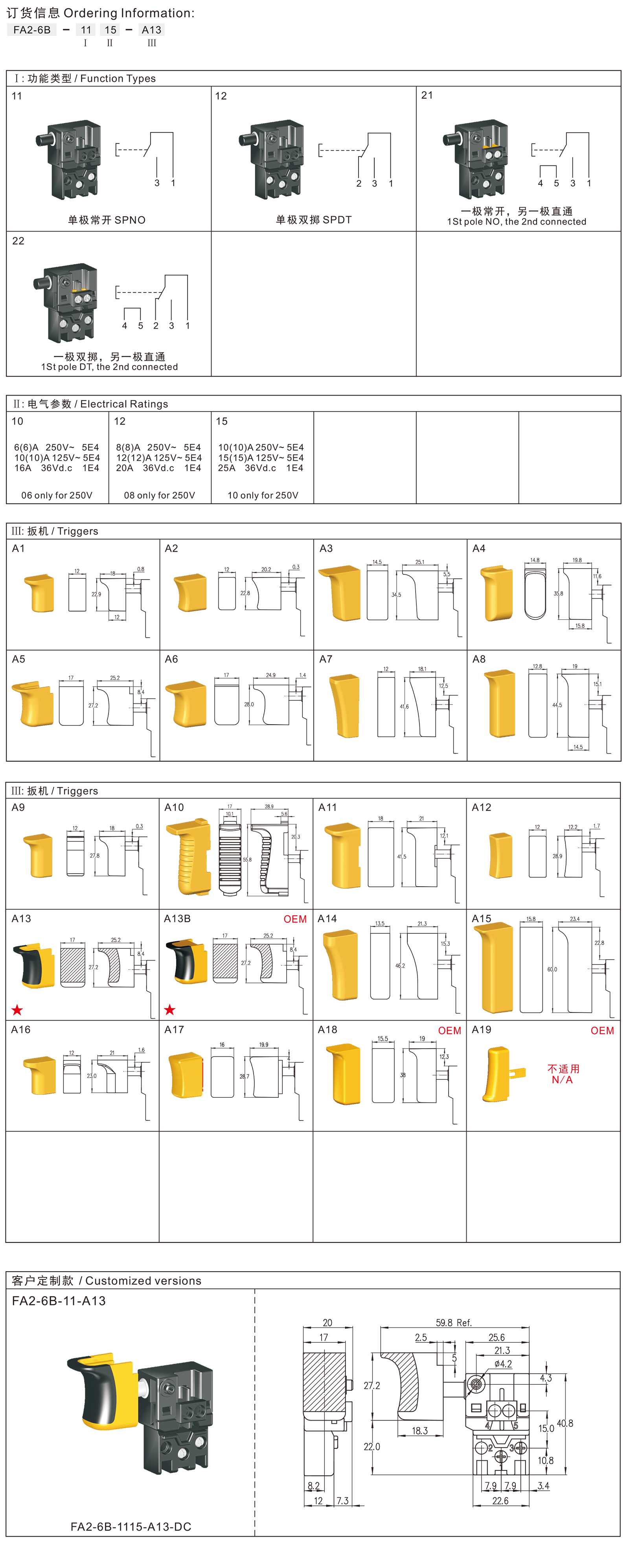 ◆FA2-6B series are one general type trigger switch, integrated dust-proof, commonly for used in power tools such as Cut-off Machines, Miter Saws, Circular Saws, Electric Hammers, etc.