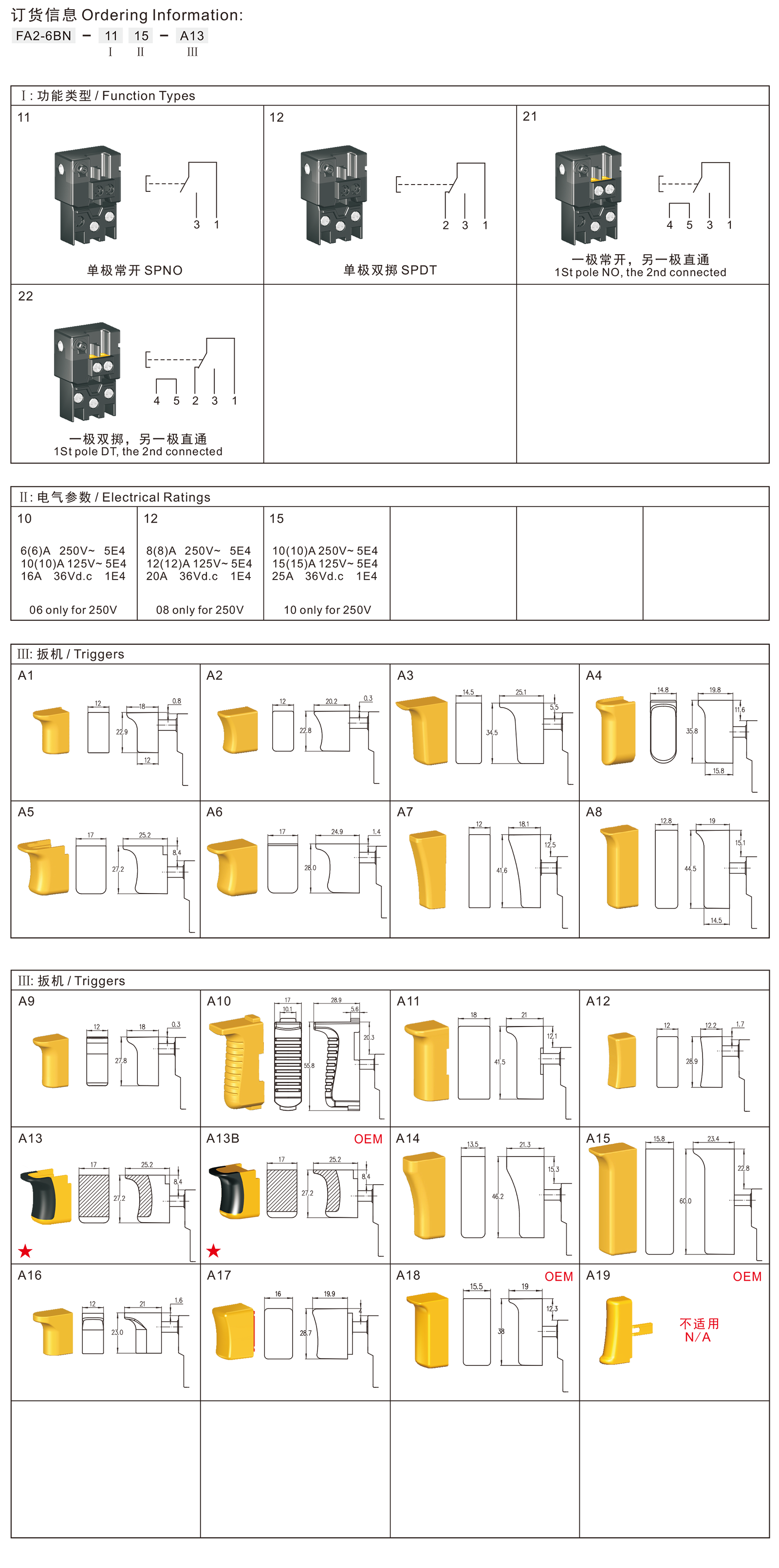 FA2-6BN系列是一款通用型的扳机开关, FA2-6B系列的防尘改进款,广泛应用于各类电动工具,如:型材切割机、斜切锯、电圆锯、电锤、电镐等。