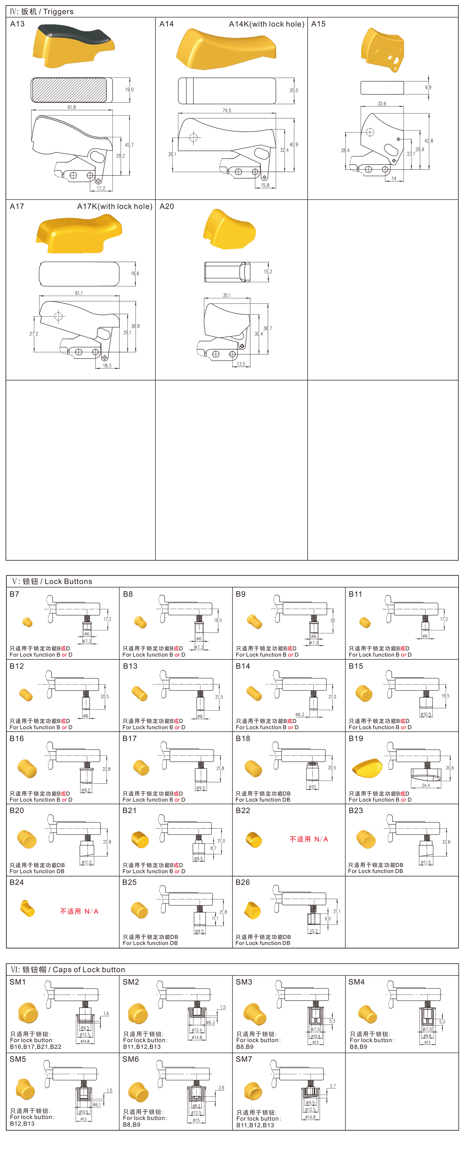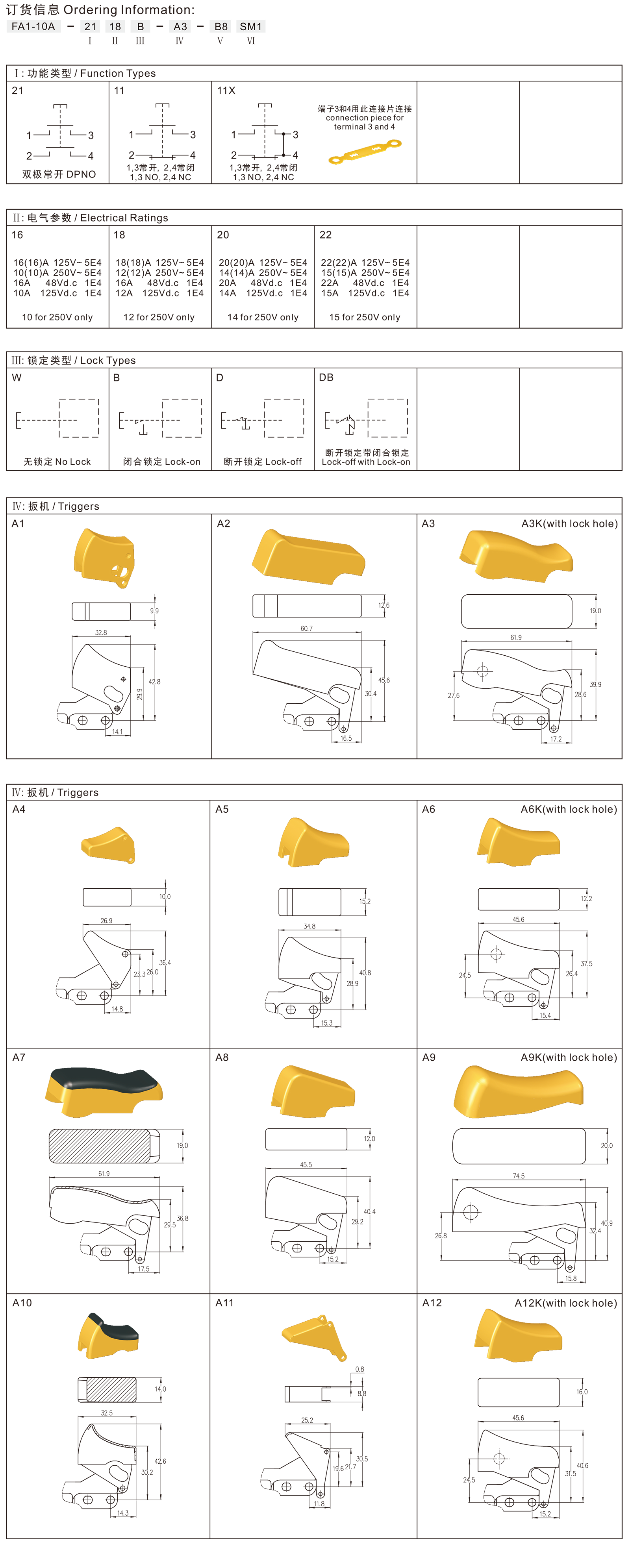 FA1-10A series are general type high rated trigger switches,integrated dustproof, with snap-action structure, for used in high rated bench top or portable power-tools such as Cut-off Machines,Miter Saws, 150mm, 180mm and 230mm Large Angle Grinders, Polishers, Circular Saws, Rotary Hammers, Demolition Hammers, Electrics Chain Saws, etc.