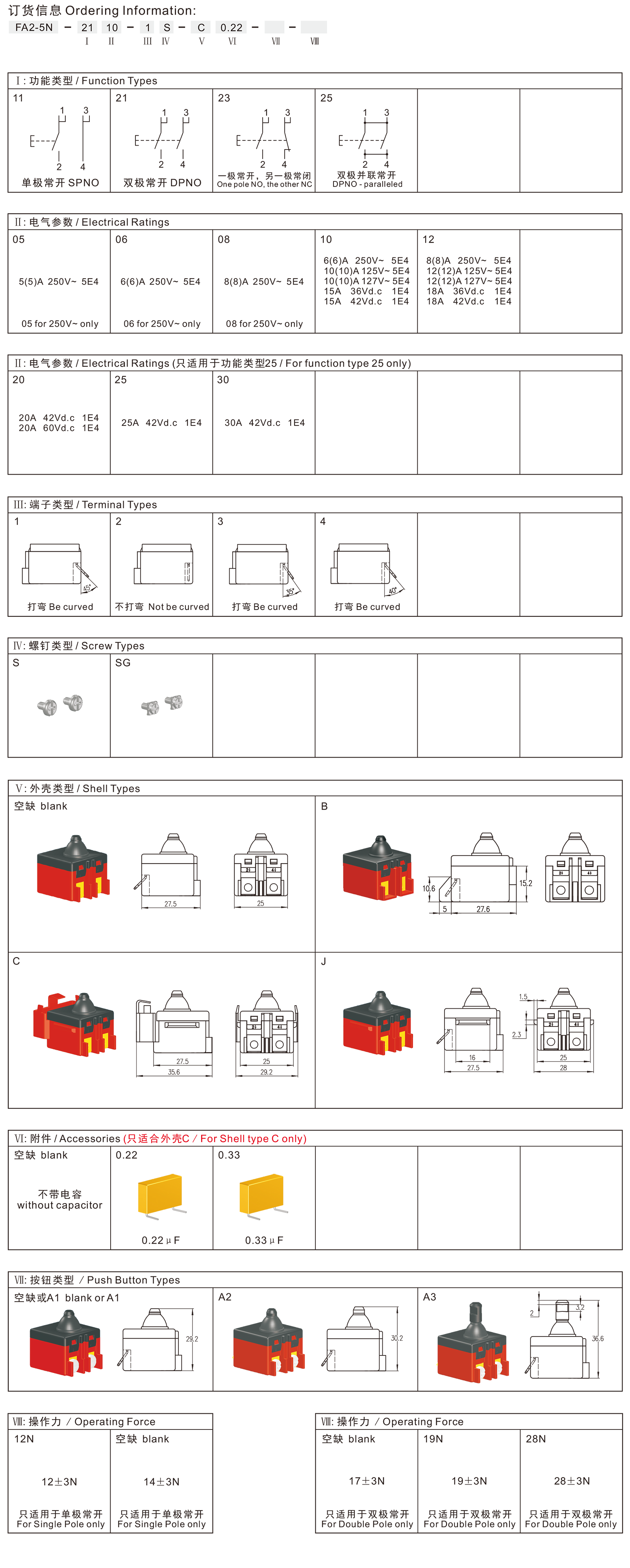 FA2-5/FA2-5N series are general type push-button switch, integrated dustproof, commonly for used in portable heavy dust power-tools such as 100mm, 125mm and 150mm Angle Grinders, Polisher Grinders, Die Grinders, Sanders, etc.