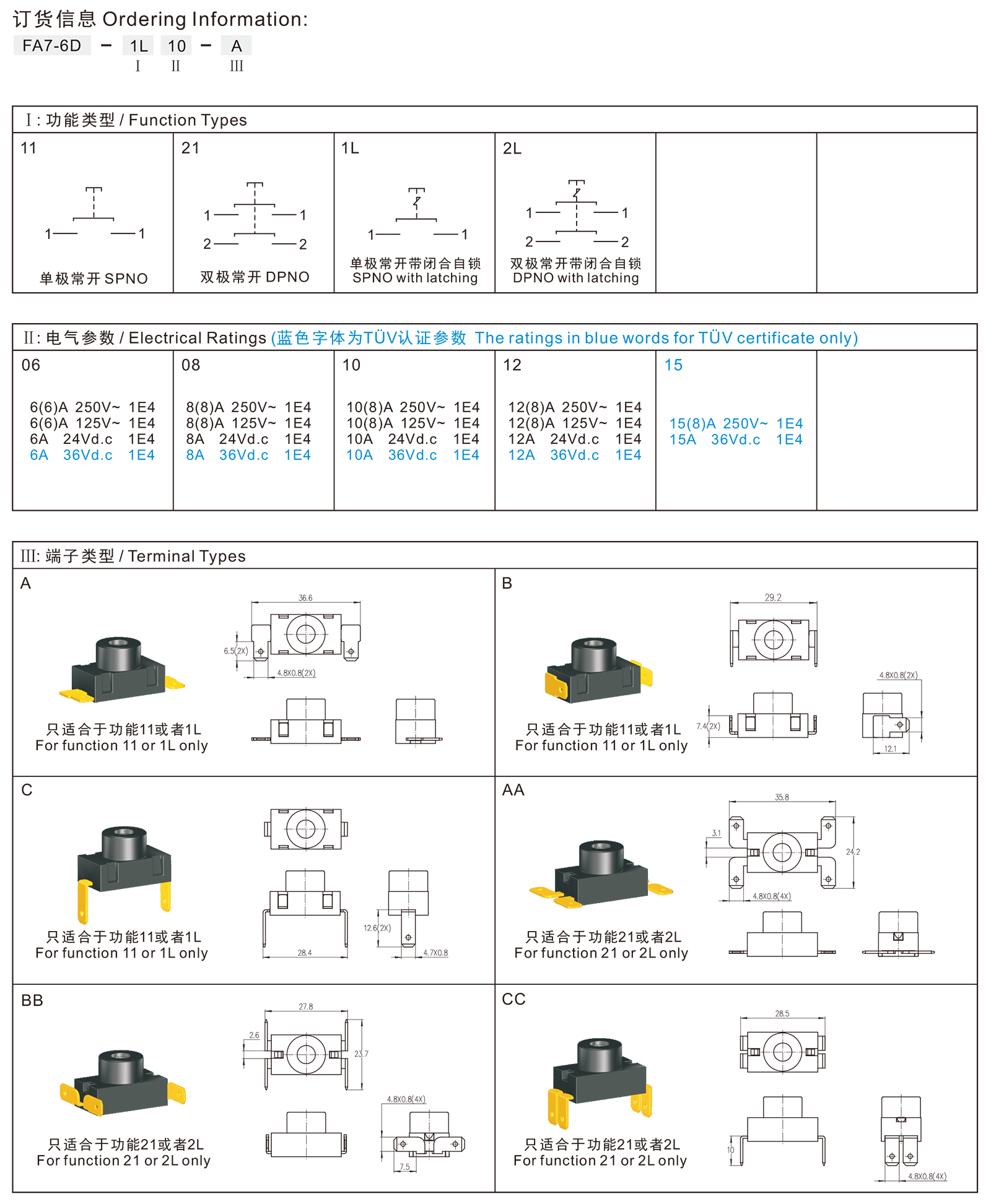 ◆FA7-6D系列是一款通用型的按钮开关,应用于各类家用电器和园林工具,如:真空吸尘器、充电灯、打草机等。